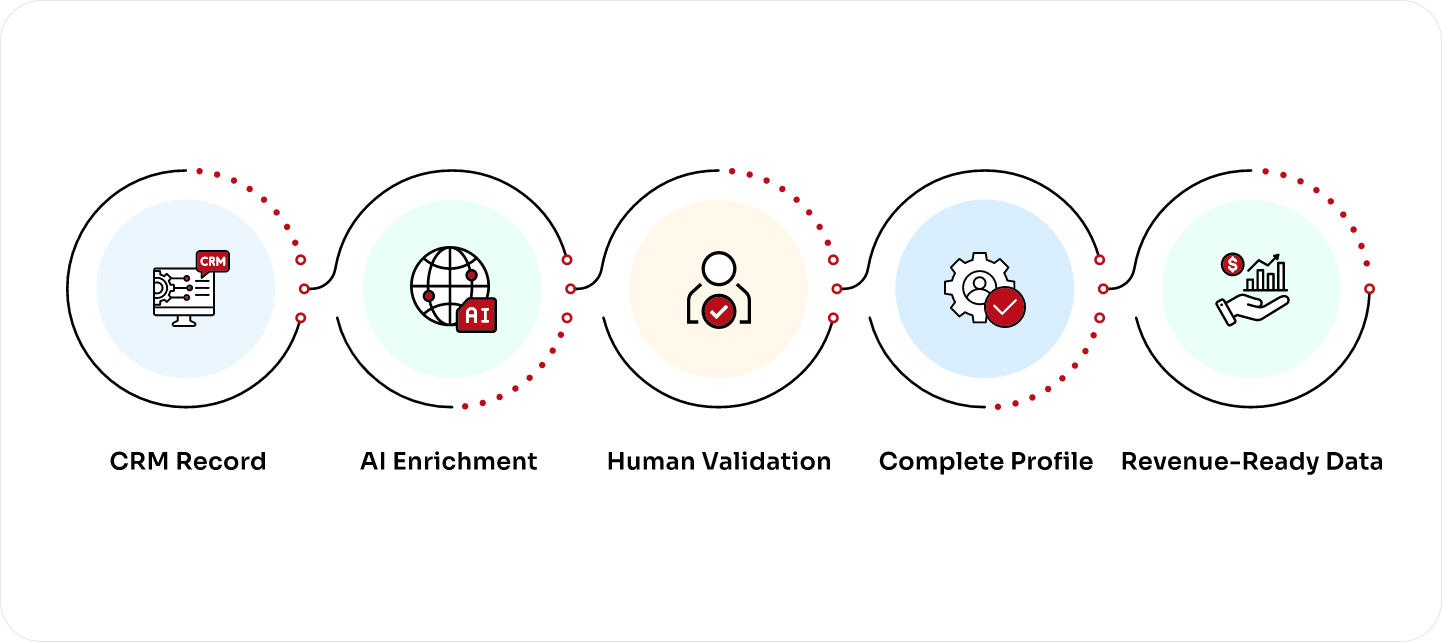 Our structured, AI-driven enrichment process ensures your CRM is complete, accurate, and always ready for action.