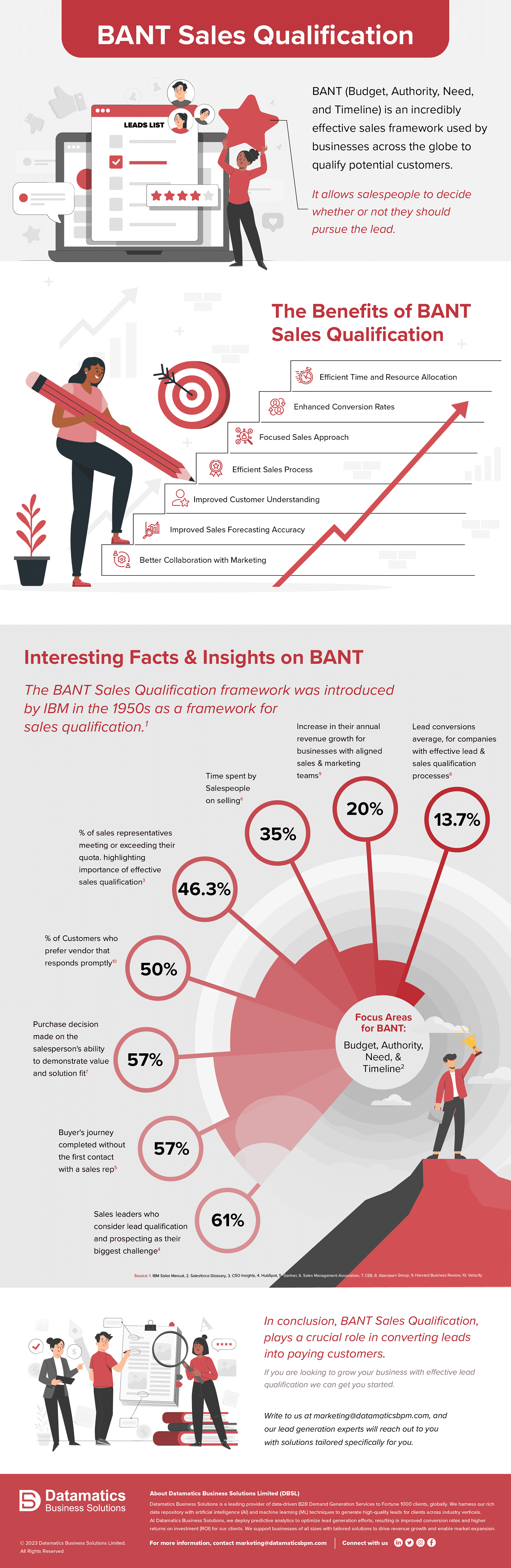 IBM developed the BANT sales qualification framework in the 1950s, and has now been included in the company’s Business Agility Solution Identification Guide. The acronym BANT stands for Budget, Authority, Need, and Timeline, and sales professionals worldwide use this framework to qualify leads effectively. Our visually captivating infographic gives us a breakdown of some interesting facts and insights about the framework while guiding you through identifying and prioritizing qualified leads.